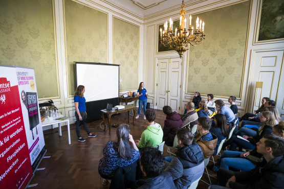 Luiken en Willemse hamerden tijdens hun presentatie op het gemoedelijke karakter van de UT. Het woord gezelligheid viel welgeteld twaalf keer. Luiken: ‘De kleinschaligheid van de UT is bijzonder voor een universiteit. Iedereen kent elkaar. Dat maakt het onderwijs veel persoonlijker dan andere universiteiten.’ Reinier (18) uit Middenbeemster ziet hierin het grootste argument om in Enschede te gaan studeren. ‘De sfeer is voor mij heel belangrijk. Als de leeromgeving leuk is, is het leren ook leuker. Ik ben in Delft geweest, maar ik vond de universiteit daar echt heel groot. Na vandaag wil ik zeker naar Enschede om de sfeer daar op te snuiven.’