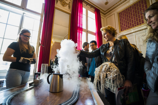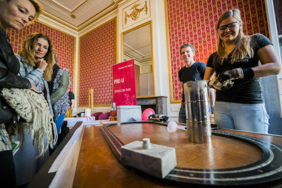Naast de presentatie bestond de pop-up University uit een infofestival, speeddates met vertegenwoordigers van verschillende studies en wetenschappelijke experimenten en proefjes. Die laatste zette de deftige rode zaal van de Twentse Ambassade in rep en roer. De chaos van ballonnen, marshmallows en stoom stak in schril contrast af met de plechtigheid van de eikenhoutenvloer en hoge plafonds.