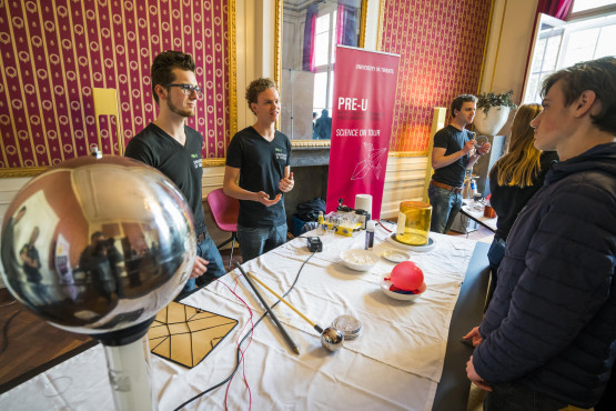 ‘Dit is niet helemaal representatief voor wat ik doe tijdens mijn studie, maar er zijn wel wat overeenkomsten,’ lacht technische natuurkundestudent Jasper de Jong (20) onder het geknetter van de Van de Graaff-generator op de tafel voor hem. ‘Op de UT zijn we vooral bezig met het begrijpen van de wereld om ons heen. Science on Tour is er eerder voor jongeren die nog niet weten of ze die technische kant op willen. Als we scholieren een beeld van de wetenschap kunnen geven dat afwijkt van de man in de labjas, zijn we geslaagd.’ Volgens Manu (16) is dat gelukt: ‘Het duurt nog een jaar voordat ik kan gaan studeren, maar ik ben nu al overtuigd dat het iets technisch gaat worden.’