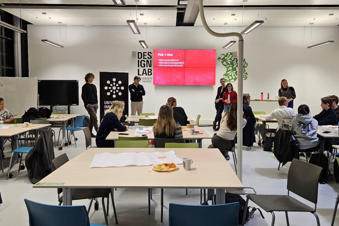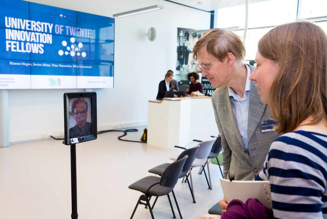 Wim Kamerman (Bussiness & IT), Sevim Aktas (Advanced Technology), Rianne Hagen (Industrial Design) and Titus Venverloo (ATLAS) are the four newest UT fellows. Yesterday they organized a Stakeholders Meeting in the DesignLab, where they introduced themselves and their first ideas to guests from all levels of the university. Unfortunately, one of the fellows Wim Kamerman could only be present in a digital form, as he is currently in Finland.