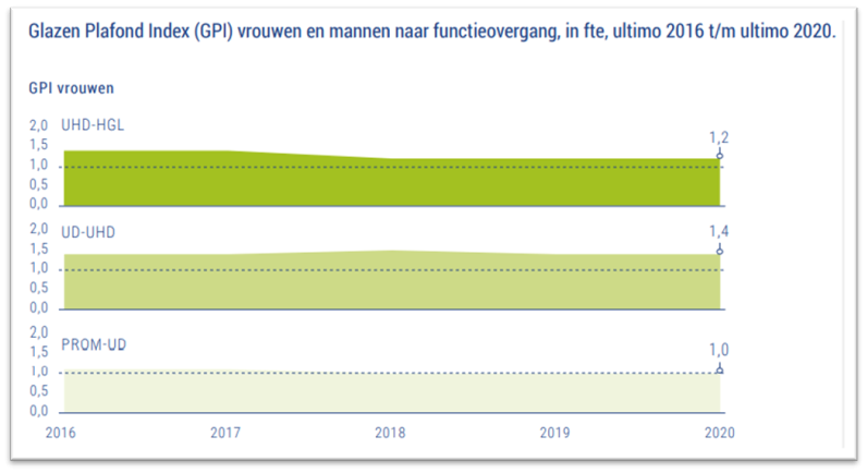 Source: Women Professors Monitor, LNVH. Percentage of women in job group divided by percentage of women in job group above. Outcome over 1: glass ceiling.
