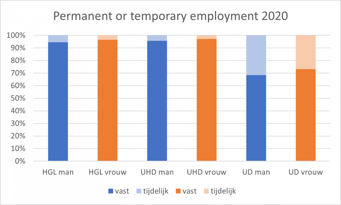 Women more often have a temporary contract, especially as assistant professor: 31.6 percent of the women have a termination date in the UD contract, as opposed to 26.8 percent of the men.