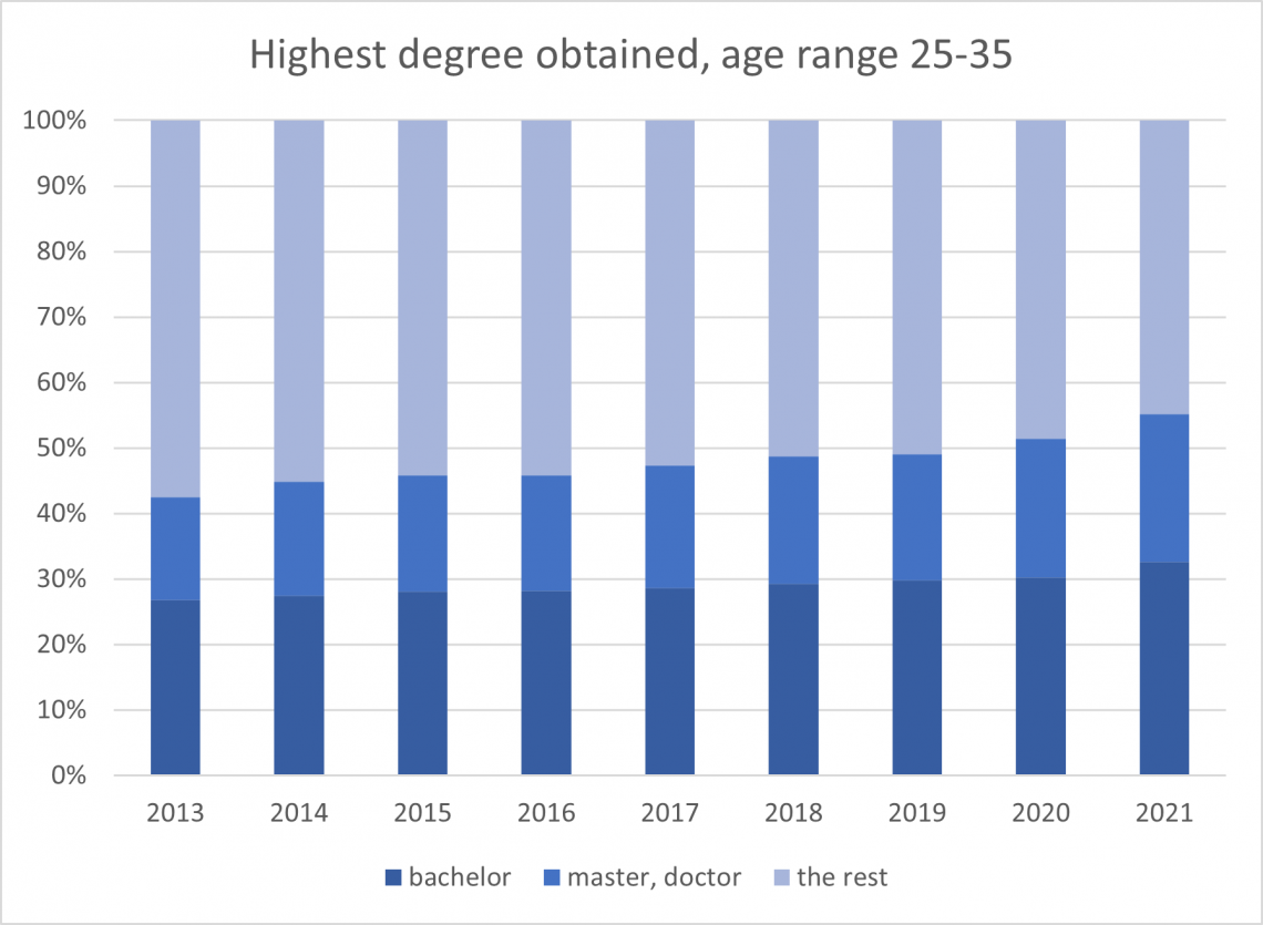 The number of holders of a Master’s degree or a PhD has risen from 16 to 23 percent – an increase of nearly half. Bachelor’s degrees have also become more commonplace. One in three have now received that degree from a higher education institution.