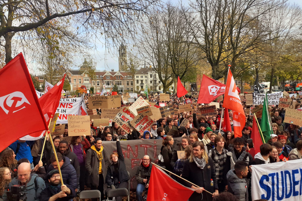 The atmosphere is upbeat. The students have set up a stage in a park near Utrecht Central Station. More and more students are joining the demonstration, but there are also young researchers and older teachers.