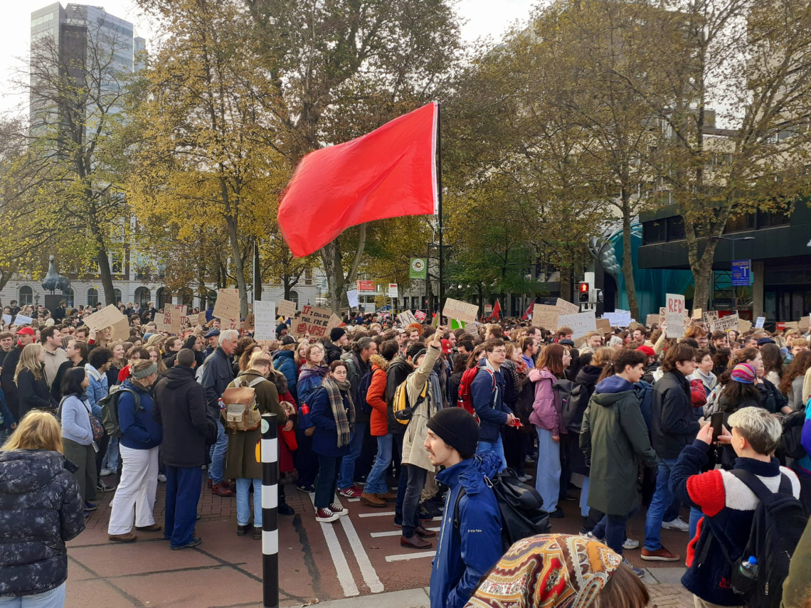 No one here understands the decision of the trade unions to cancel the protest in Utrecht because of possible violence by pro-Palestinian demonstrators. From whom does the violence actually come, they wonder, isn't it rather from the police who disperse demonstrations and from Israel itself? 'Free, free Palestine!', they say. Others hold up protest signs with texts such as 'No bombs but books'.
