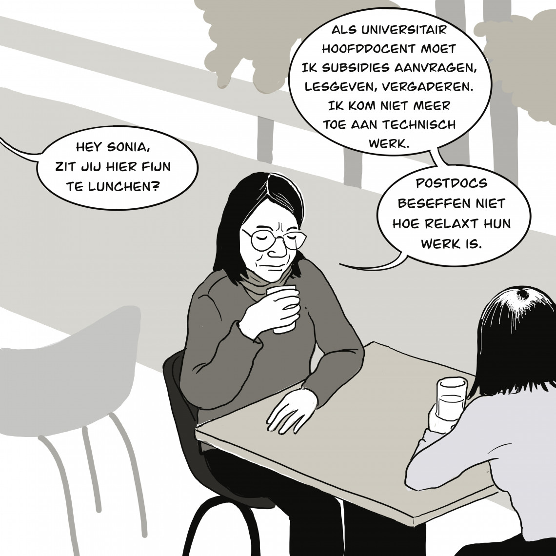 Zo gaat dat vaak in de wetenschap, weet ze onderhand. ‘Als universitair hoofddocent ben je een soort ondernemer, dus je schrijft welk onderzoek nodig is voor welke toepassing. Je moet subsidies aanvragen, geld loskrijgen, lesgeven, deelnemen aan allerlei vergaderingen van de universiteit op organisatorisch gebied. En op al die onderdelen moet je proberen hoog te scoren, je moet in alles goed zijn. Er zijn maar zoveel uren in de week. Dus als mensen het hebben over het laboratorium, denk ik: ik heb nauwelijks tijd om mijn collega’s te begroeten!’