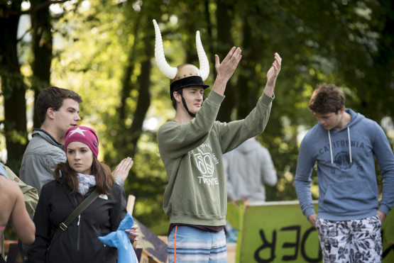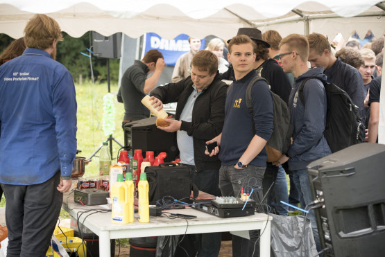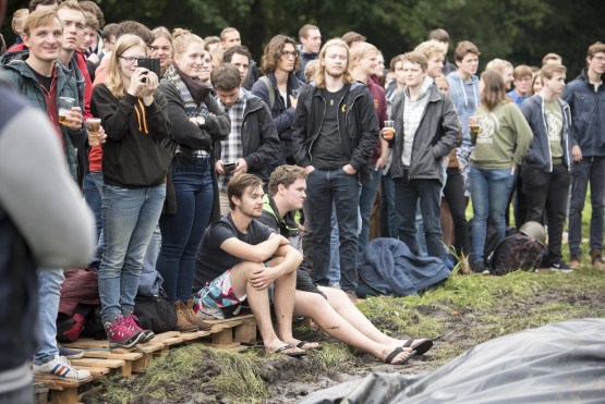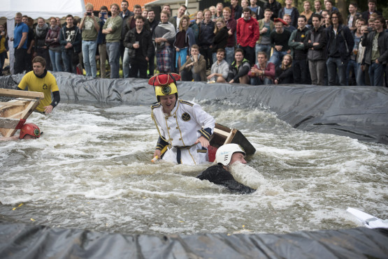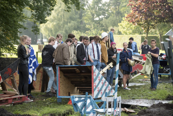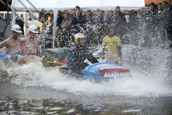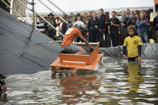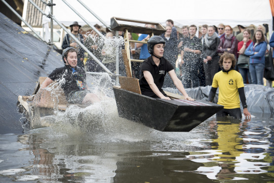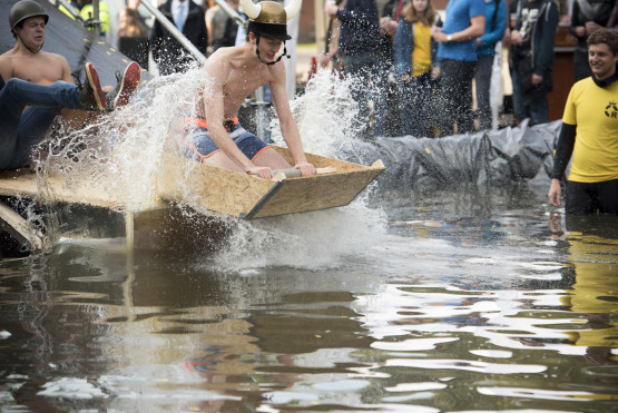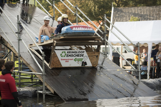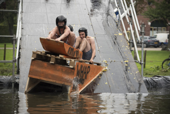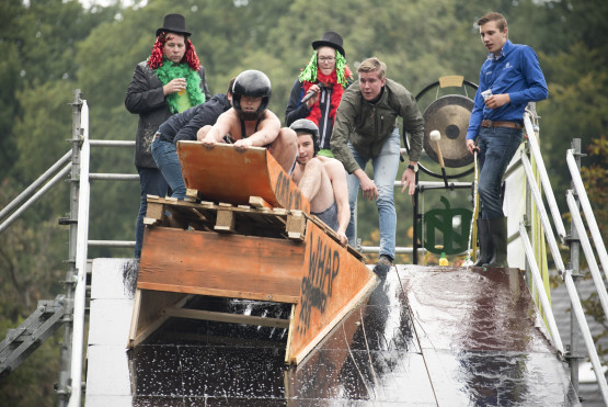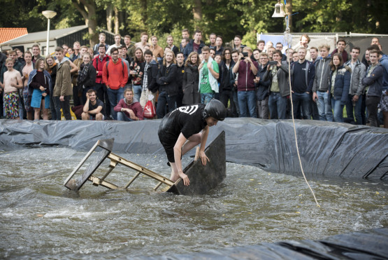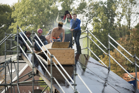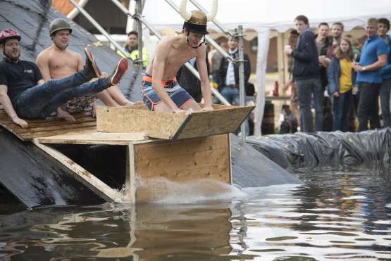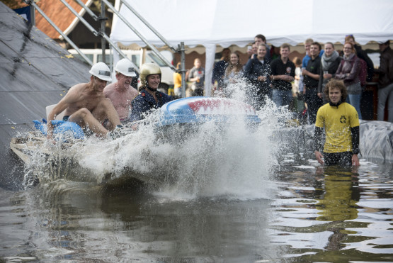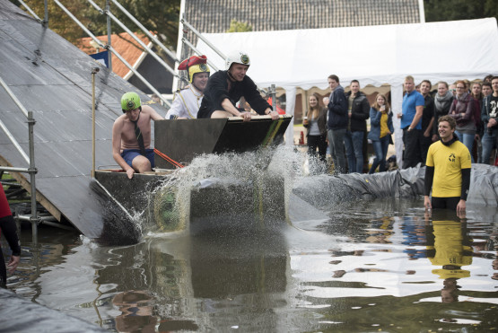 Te land, ter zee en in de lucht! UT-studenten konden woensdagmiddag een flinke dosis jeugdsentiment ophalen. Met dank aan studievereniging Isaac Newton stond er naast Erve Holzik een zeephelling klaar en konden studenten met een bootje naar beneden, voor het welbekende tobbedansen.