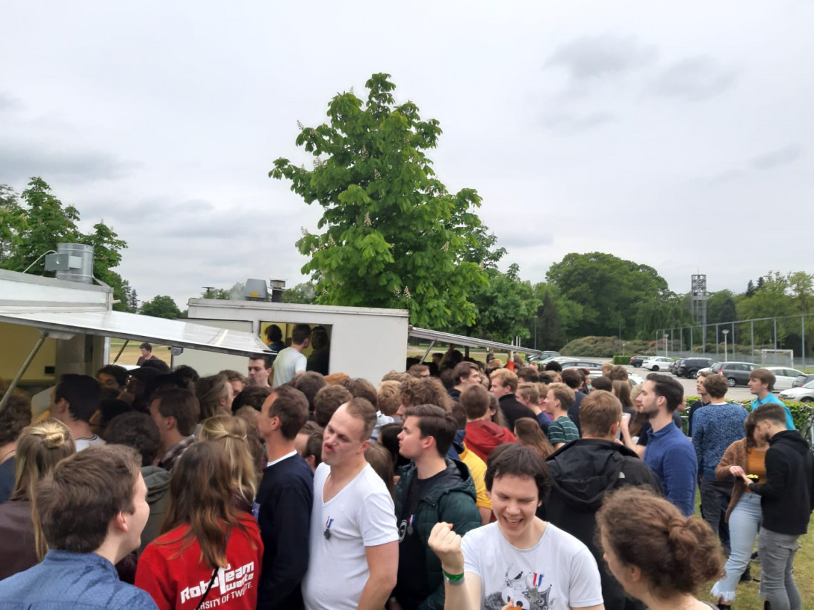 Buiten bij de Vestingbar staan twee snackwagens met een gigantische rij. De deelnemers hebben, begrijpelijk, enorme trek in een vette hap. Er zit alleen geen beweging in de rij hongerige studenten. De druk van de mensen achter in de rij maakt het onmogelijk om comfortabel te kunnen staan. De studenten vooraan maken zich daarnaast schuldig aan het bedrijven van zogenaamde frietjespolitiek: frikadellen, kaassoufflés en kroketten gaan snel door naar de vrienden aan de zijkant van de rij. Een enkeling geeft de vette happen gelukkig wel door naar de hongerige meute, achteraan in de rij. Kwestie van nog even doorbijten en dan is ook deze felbegeerde orde van de Elfbierentocht 2019 in de pocket.