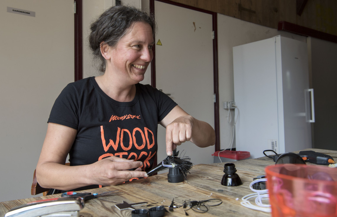 Bij boerderij Bosch worden verschillende workshops aangeboden. Lachyoga, percussie en creatief met plastic. De laatste workshop wordt gegeven door Elze van den Akker. Ze loopt vaak met haar neus naar beneden en verzamelt alle plastic spullen die ze tegenkomt. Dopjes, flessen, oude paraplu’s. ‘Dingen die de aarde vervuilen, maar waarmee je nog zoveel leuks kunt doen.’