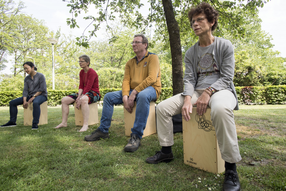 Achter boerderij Bosch, lekker in de schaduw onder de bomen, heeft Edwin Grovell, ook bekend van The Voice senior, zich gesetteld. Hij geeft een workshop djembe. Tien UT-ers hebben zich aangemeld om dit West-Afrikaanse instrument onder controle te krijgen. Als Grovell even een staaltje van zijn kunnen weggeeft, verschijnt er bij de ene deelnemer een brede lach om de mond en bij een andere een argwanende, ietwat wanhopig blik. Een blik die zegt: moet ik hem dat straks nadoen? Maar Grovell blijkt een geweldige leraar. Na een kwartier weten de tien UT’ers ritmische klanken uit te persen, die nog in de maat zijn ook. ‘You make me happy!’, roept Eddy luid. En hij vraagt een speciaal applaus voor deelnemer Sienie van ’t End (Campus & Huisvesting, Reserveringsbureau). ‘Sienie zei voordat de workshop begon tegen me dat ze vreesde dat ze het niet kon. En kijk haar nu eens!’’, prijst Grovell haar.