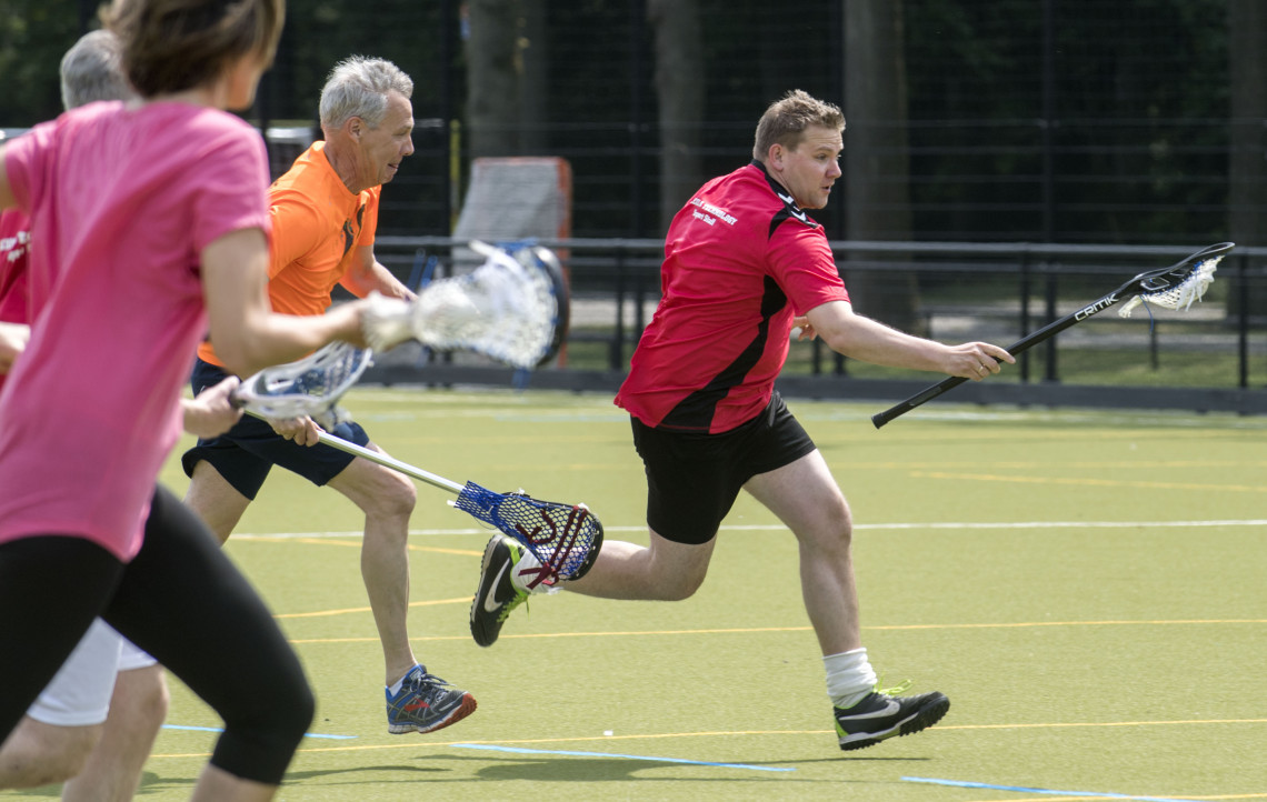 Op een van de sportvelden achter het Sportcentrum klinkt gejuich. Roy Bruil van TNW scoort overtuigend de 1-0 tegen het team van ITC. Ze spelen Lacrosse, een spel waarbij je met een stick met een netje eraan de bal moet opvangen, om die vervolgens in het doel van de tegenstander te deponeren. De fraaie actie van Bruil wekt de indruk dat het een fluitje van een cent is óf dat hij er elke dag op oefent. Niets is minder waar. ‘Wanneer ik voor het laatst Lacrosse speelde? Vorig jaar, op de sportmiddag van de UT. Toen maakte ik voor ’t eerst kennis met deze sport.’