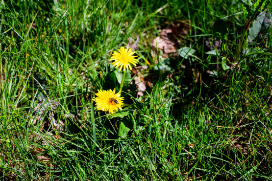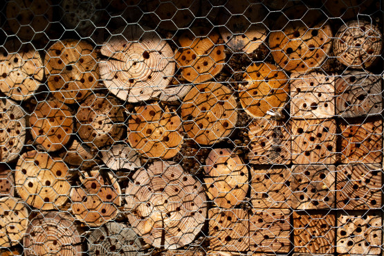 The first stop of the day is in the patch of trees across the road from the Box, the student housing complex. An old dead tree lies on the ground, half sunken in dead leaves, its twisted roots exposed to the air. Kirschbaum leads the way to it. ‘We try to leave as much dead wood as possible’, he says. ‘Because beetles and other insects make their homes in it and leave little tunnels that bees lay their eggs in.’ He looks around, then points to a dead tree that is still upright, most of its bark missing and wood bleached white. ‘Standing dead wood attracts different species than laying dead wood. So it’s important to have dead standing and dead laying trees’. It’s the ‘natural version of a bee hotel’, Kirschbaum says.