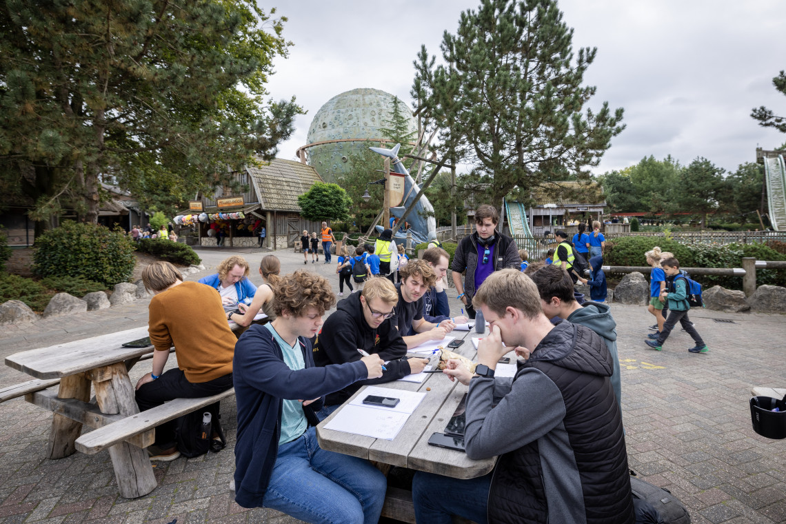Not before long, a remarkable contrast unfolds: a screeching school class flying by in the Tomahawk, in the face of students busily poring over diagrams and equations on their notebooks or drawing tablets. On the other side of the park, at the Apollo whirligig, the picture is no different: hyperactive children run past Mechanical Engineering students who have littered a picnic bench with calculators, notepads and a bag of pepernoten.