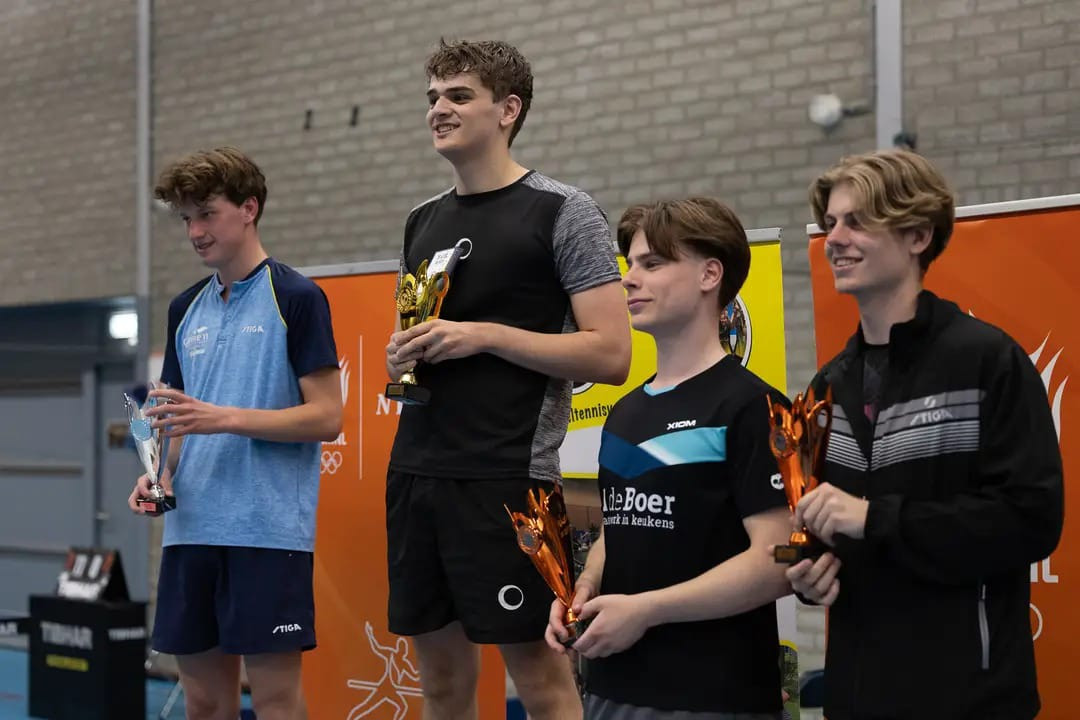 Bloed, zweet en tranen stopte hij de afgelopen maanden in zijn wedstrijden en trainingen, maar dat leidde helaas net niet tot deelname aan het Europees Kampioenschap in Tsjechië. Welk doel stelt het talent zichzelf voor de komende periode? ‘Het doel is om een Eredivisie-speler te worden en dat te blijven. De concurrenten zijn inmiddels een stuk sterker en verder in hun ontwikkeling dan ik. Het zou mooi zijn als ik geld verdien aan tafeltennis, maar ik hoef er later niet van te leven.’