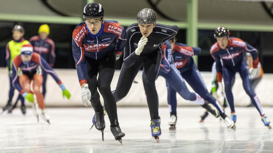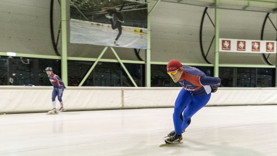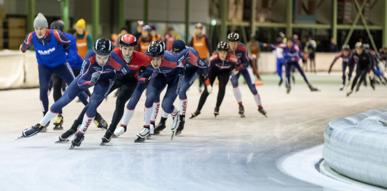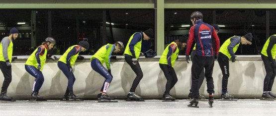 De snelste leden dragen geen mutsen of hesjes en bewegen daarom zo aerodynamisch mogelijk in roodblauwe pakken. De binnenste baan is hun domein. Hoe verder we naar de buitenkant van de baan kijken, hoe meer gekleurde hesjes we aantreffen. Daar oefenen leden het ‘pootje over’ in de bocht. ‘Dat zijn leden die minder goed zijn, of niet zo veel schaatservaring hebben. Aan de buitenkant van de baan zie je meerdere trainers, die uitleg over schaatstechniek geven. Soms, zoals afgelopen maandag, is het heel druk. Dan schaatsen er meer dan honderd leden, maar omdat iedereen weet wat hij of zij moet doen is het altijd lekker schaatsen hier.’