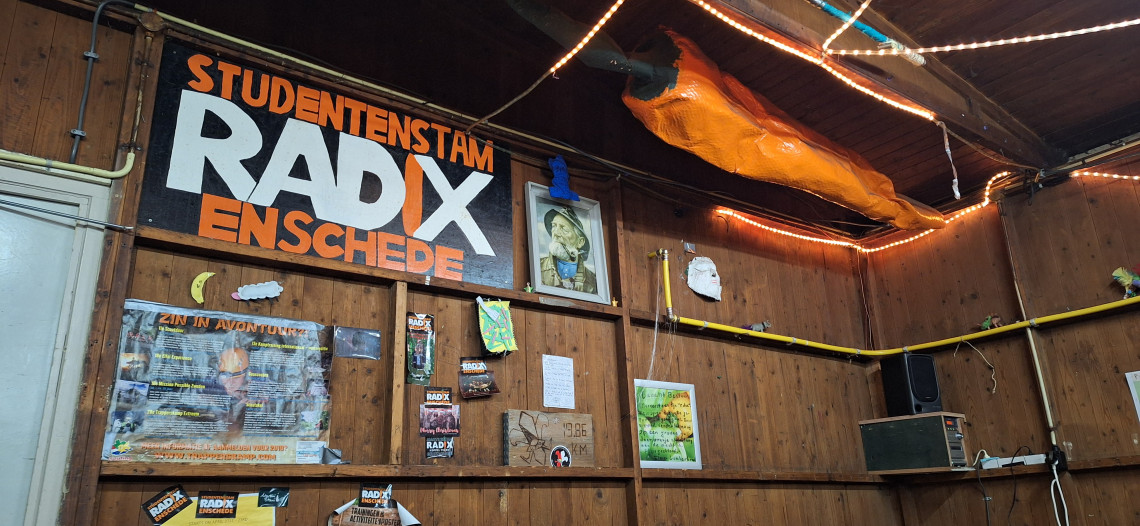 Of nou ja, blokhut… Noem het maar blokhok. Niet heel eerbiedig, maar Radix is wel een van de weinige studentenscoutings met een eigen onderkomen. ‘Uitermate geschikt voor feestjes waar het allemaal wat minder zachtzinnig hoeft,’ weet voorzitter Jenna Zaagsma. Op z’n Twents gezegd kan hier nog geen blind paard wat kapot lopen. Over Twents gesproken: Tukker FM zorgt de hele avond voor de muzikale omlijsting. ‘Donders mooi.’