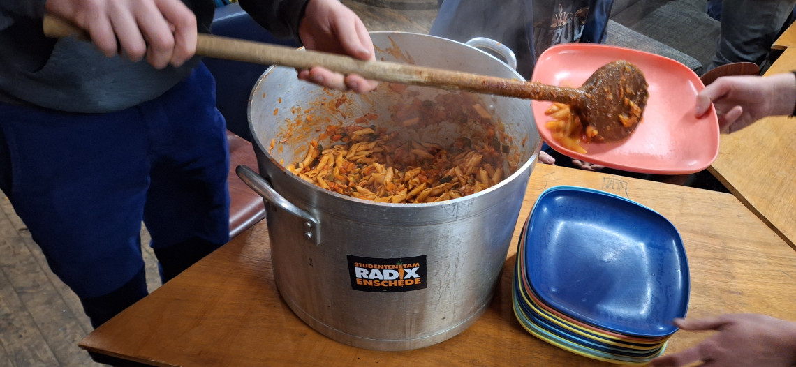 Zo rond half zeven op de maandagavond zijn de dames en heren van Radix al druk in de weer met wortels, uien en knoflook snijden. Wegspoelen met bier of water, iets anders is nog nooit gevraagd. In het keukentje wordt in een XXL pan met een XXL pollepel een XXL pastamaaltijd klaargemaakt.