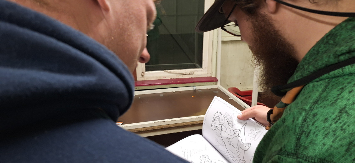 ‘Het gaat er helemaal niet om wat je doet,’ vertelt Gies, terwijl hij met een oranje stift zijn ziel en zaligheid in een plaat van een Tyrannosaurus Rex legt. ‘Je hebt hier gewoon een hoop lol onder gelijkgestemden. Hier hoef je je niet mooier voor te doen.’ Daan Hartog, die voor de gelegenheid op tafel is geklommen en een robothaai inkleurt voegt toe: ’Het is elke week een verrassing wat voor gekkigheid er nu weer komt.’