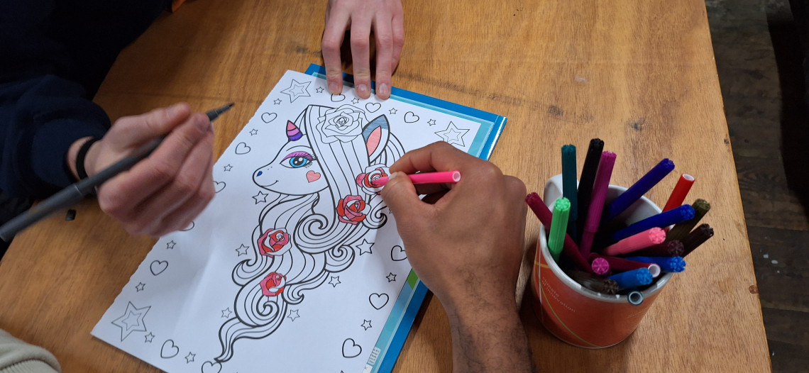 Wat ze gaan doen is elke week weer afwachten. ‘Werktuigbouwkundigen willen bijvoorbeeld het liefst pionieren: torens bouwen van hout en touw,’ beschrijft Mosterd. Vanavond zijn de heren van de AKI en industrieel ontwerp aan de beurt. Dat wordt dus iets creatiefs: ‘Jullie gaan vandaag in tweetallen een kleurplaat maken!’ roept Sjoerd Kuiper. Gejuich alom. Kleurboeken vol prinsessen, dino’s en robots worden rondgedeeld. Maar dan de twist: er moet gestreden worden om de kleurstiften. Een ruwe afvalrace volgt. De winnaar mag een kleurstift uitzoeken.