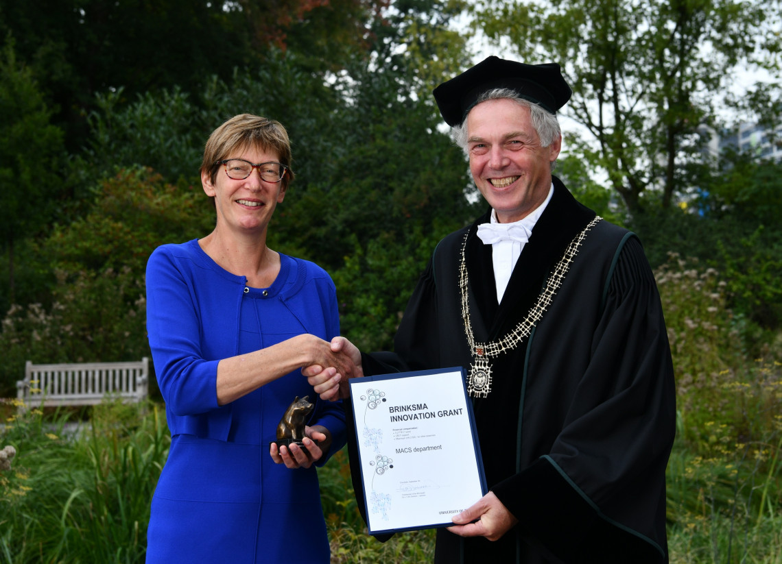 Foto: Brigit Geveling ontvangt de Brinksma Innovation Grant uit handen van toenmalig rector Thom Palstra.