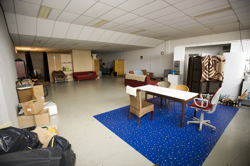 ‘Dit is toch wel een bijzonder huis. De douchecabine en het keukenblok waren er al toen ik hierin kwam. De douchecabine heeft schotten zodat je toch nog een beetje privacy hebt. We hebben het winkelpand dus een beetje omgebouwd om er toch een soort huis van te maken. De woonkamer zitten we bijna nooit. Wel eten we meestal samen aan de tafel bij de keuken.’