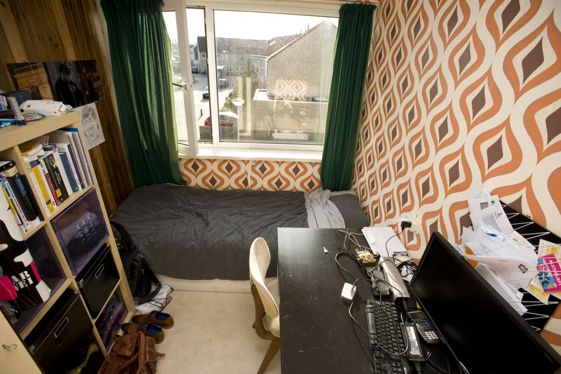 ‘Ik vind mijn kamer vooral bijzonder goedkoop en knus. Daarnaast zorgen het behang, de gordijnen en de schrootjes voor een originele jaren 70-look. Ik heb geen flauw idee waar alles vandaan komt. De aankleding is op z’n zacht gezegd enigszins gedateerd. Maar omdat ik er alleen slaap, heb ik tot nu toe nog niet de moeite genomen er ook maar iets aan te veranderen. Mijn creatieve voorgangers hebben er vast veel inspiratie uit geput.’