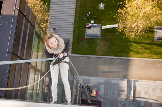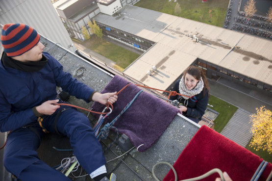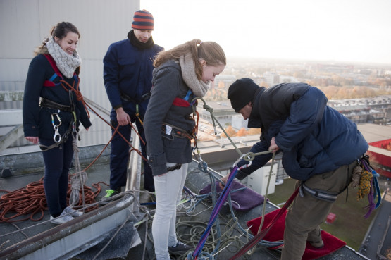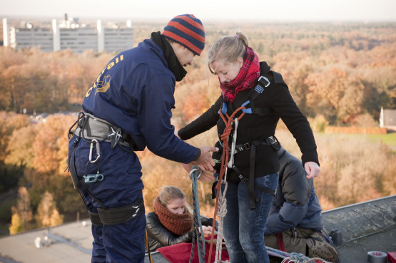 ‘Wauw, dat was echt eng’, klinkt het als Britt Moritz (24) en Ryanne Swanenburg (22) met hun beide benen weer op de grond landen. ‘Nu ik hier sta, vind ik het echt heel vet dat ik het gedaan heb, maar op het moment dat je met beide benen boven over de rand moet begin je hem wel even te knijpen’, zegt Moritz. ‘Ik vond het eerst allemaal wel meevallen, totdat mijn instructeur me doodleuk vertelde dat het touw niet helemaal goed zat. Toen was mijn zelfverzekerdheid even ver te zoeken’, vult Swanenburg aan. Beide dames kwamen veilig en voldaan beneden: ‘we zouden het zonder twijfel zo weer doen’. En dat is ook de mening van de andere studenten die één voor één naar beneden komen gegleden. Door de kou is iedereen wel flink verkleumd, dus de warme chocomel gaat er met alle gemak in.