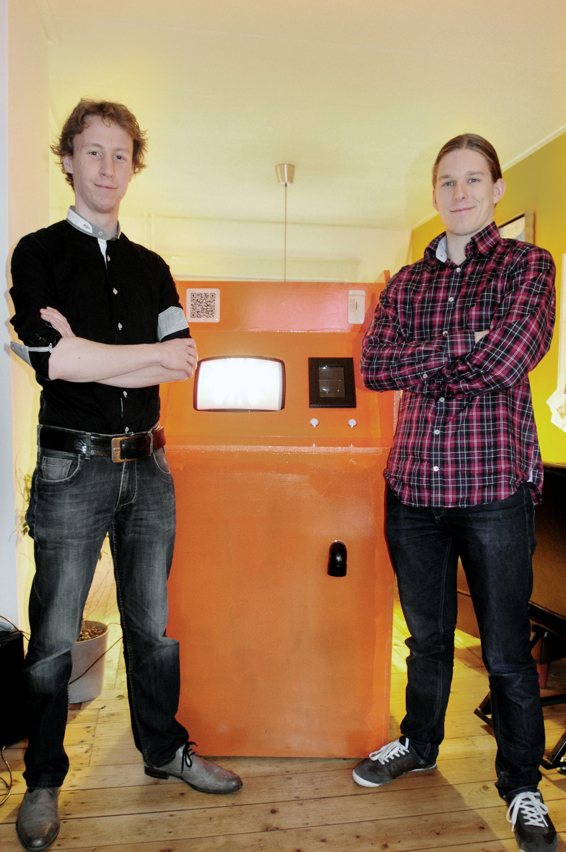 Bitcoins. Veel mensen hebben er wel van gehoord, maar hoe die zogenaamde ‘nieuwe munt’ precies werkt, is voor een groot deel van hen niet helemaal duidelijk. ‘Wat is het, hoe werkt het en hoe kom ik eraan?’ vragen veel mensen volgens student creative technology Douwe Bart Mulder. ‘Wat het is en hoe het werkt, kan ik wel uitleggen. En vanaf nu kun je er ook gemakkelijk aan komen!’ Mulder (op de foto met het zwarte overhemd) bouwde samen met zijn huisgenoot van Saxion (Maurice Koopman) een Bitcoin-automaat, waarmee je de Bitcoins simpelweg kunt kopen.