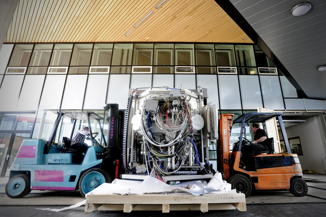 Het verhuizen van de trillingsgevoelige apparatuur nam maandagochtend enkele uren in beslag. Een deel van de gevel van Carré werd ervoor gedemonteerd.