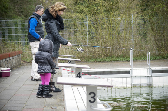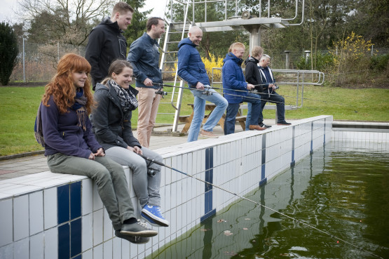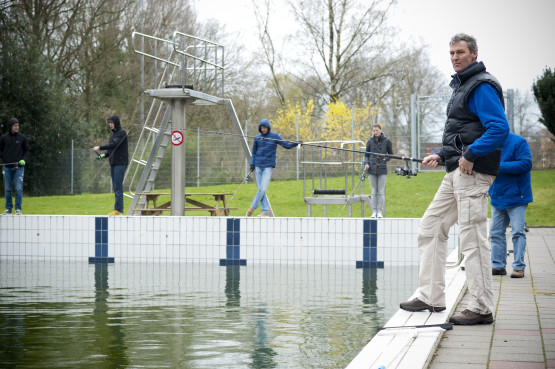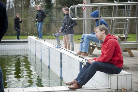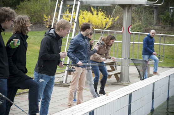 Geen probleem. Gewapend met hengels, aas en schepnetten, positioneerden de ongeveer dertig medewerkers zich langs de kant van het buitenzwembad op de campus. Rustig turend naar de dobber hengelden ze er 35 van de 60 forellen eruit. ‘De andere 25 komen we vast tegen als we het zwembad laten leeglopen voor de grote schoonmaak’, zegt Marcel ter Bals, manager van het openluchtbad. Na de visvangst, verdwenen de forellen op de barbecue. ‘Er zaten ook enkele, dikke zalmforellen tussen. Heerlijk zo’n verse vis van de barbecue.’