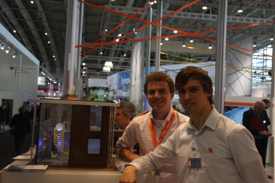 Tussen de tulpen, posters en banners staan deze maandagmorgen Max Kerkers (l), student technische informatica en Max Vervoort, student elektrotechniek. Samen bemannen ze het Smart Grid House, een modelwoning met slim energieverbruik. ‘Ja, premier Mark Rutte en Bondskanselier Angela Merkel zagen we vanmorgen voorbij komen’, zegt Vervoort opgewekt. Met het hoogwaardigheidsbezoek begon de eerste dag van de Hannover Messe goed voor de studenten. Ook daarna was er genoeg klandizie, verzekeren de twee. ‘Bezoekers zijn nieuwsgierig’, vertelt Vervoort. ‘ Ze zien dat er wat gebeurt in het huis en het lijkt net of er iemand thuis is. De televisie gaat aan of uit en hetzelfde gebeurt met de lampen. Dat trekt de aandacht.’ Veel vragen krijgen ze ook. ‘Mensen willen weten hoeveel zonnepanelen nodig zijn voor het energieverbruik in huis of ze delen hun eigen ideeën en dan heb je ineens een heel interessant gesprek.’ Kerkers: ‘Waar het hier allemaal omdraait? Connecties opdoen en in contact komen met interessante partijen.’