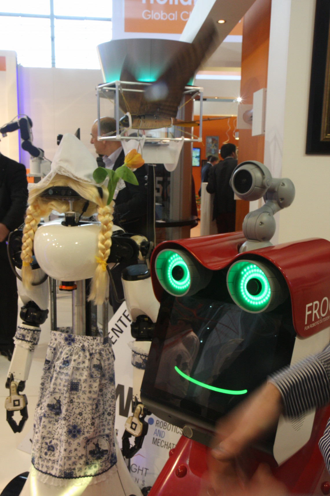 Hoewel de beurs nog maar net de deuren opende, is het deze ochtend al aardig druk bij het High Tech paviljoen. Twee robots, de autonome campusrobot FROG van de UT en ‘Frau Antje’ van de Technische Universiteit Eindhoven, strijden om de aandacht. Filmploegen en cameramannen scharen zich om de machines als ze een ’wandelingetje’ maken. Het publiek houdt de pas in, kijkt, bewondert en lacht om de twee apparaten.