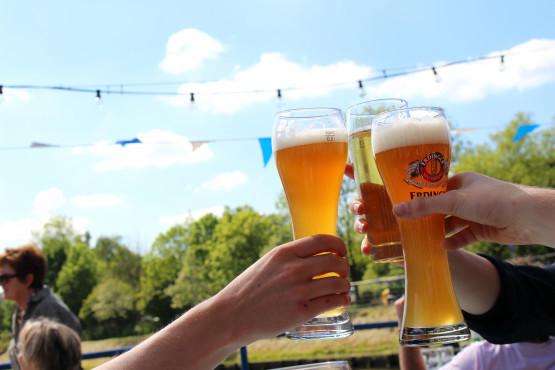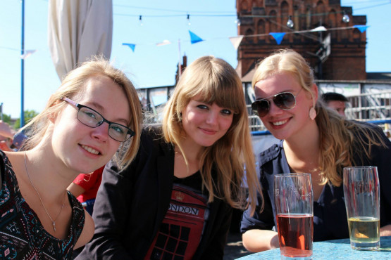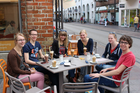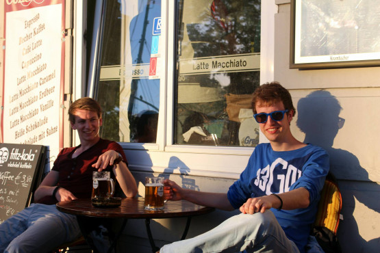 We pakken de bus naar het centrum en daar komen we rond zeven uur aan. Ons doel is bereikt: voor het avondeten in Lübeck. We zoeken de andere VGST’ers op, die al op een terras zitten. De serveerster lacht bij het horen van onze bestelling: “Elf Mahl Schnitzel mit Fritten, bitte”. We wisselen liftverhalen uit, sommigen zijn ’s middags al met één lift in de stad aangekomen. Aldert geniet van zijn welverdiende halve liter bier, waarnaast mijn kleine glas ‘Apfelsaft’ er behoorlijk karig uitziet.