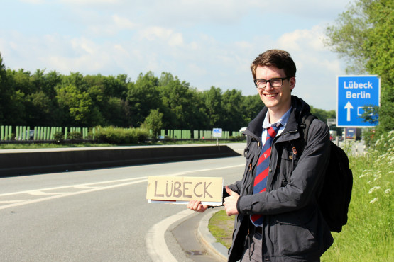 Na een ijsje, spreken we een man aan met een Mercedes. Wolfgang is op weg naar Rostock en wil ons meenemen tot voor Lübeck. Het is half vijf als we vertrekken. De gepensioneerde man vertelt ons in gebrekkig Engels dat hij wel eens tulpen, tomaten en Goudse kaas uit Nederland meeneemt. Ook vertelt hij over zijn vijf kinderen en twee kleinkinderen en leert hij ons van alles over de omgeving. Hij kent Lübeck en benoemt de mooiste gebouwen die we daar moeten zien. We doen door files twee keer zo lang over de rit, maar we hebben alle tijd. Om half zeven ’s avonds zet Wolfgang ons af ten zuiden van Lübeck, maar niet voor hij er zeker van is dat we een bushalte kunnen vinden.