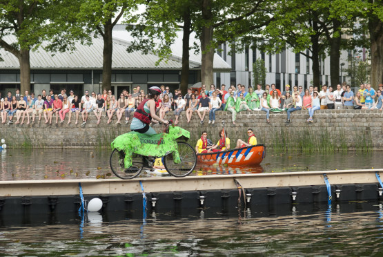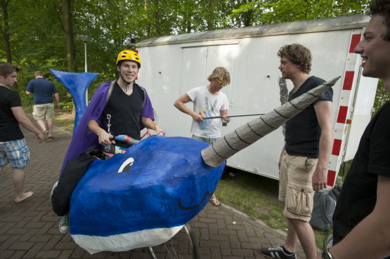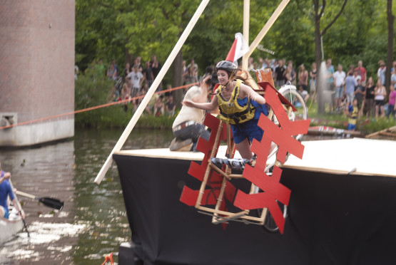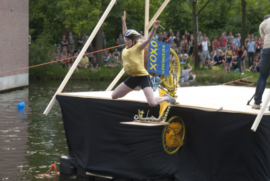 Rosan Nijkamp, die namens damesdispuut Dionysus de bel moest gaan luiden, ging wel vrijwillig. Rosan: ‘Als de avond vordert en je wat biertjes drinkt, ga je soms rare dingen zeggen. Ik ben nu ook best zenuwachtig. ’ Met een fiets omgetoverd tot druiventros ging Rosan van de schans, de bel haalde ze niet. Halverwege het parcours raakte Rosan en de fiets te water. ‘Ik kon helemaal niks zien, de ballonen zaten ervoor. Ik heb alleen maar naar de bel gekeken, dat was misschien niet zo slim. Gelukkig viel ik niet hard en wist ik net een slokje slootwater te voorkomen. Het water was wel lekker warm!’. Rosan vervolgt: ‘Het was eng en super leuk, maar de volgende keer mag iemand anders.’