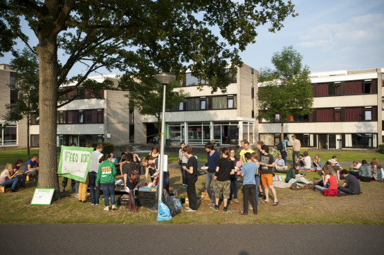 Ook ging ze vrienden en huisgenoten langs om ze uit te nodigen voor het diner en om kookploegen in te schakelen. Omdat de reacties in eerste instantie niet erg meewerkend waren, deed ze er nog een schepje bovenop. 'Ik denk dat ik wel bij zo'n veertig huizen op de campus heb aangebeld om te vragen of ze mee willen doen met Feed100. Dat heeft veertien koks opgeleverd.’