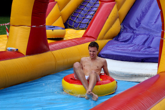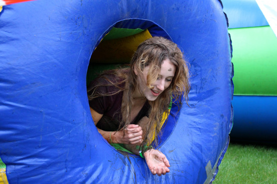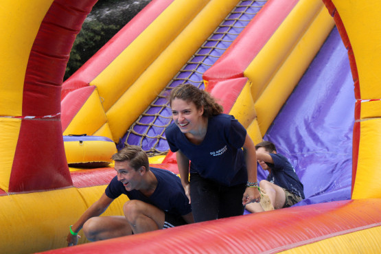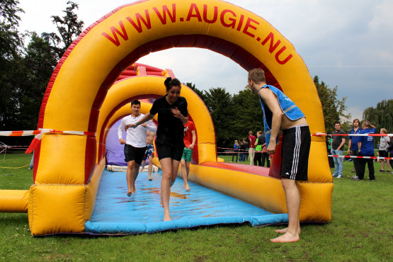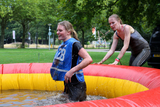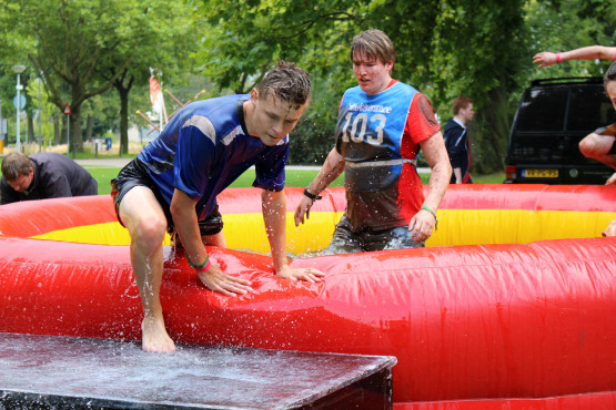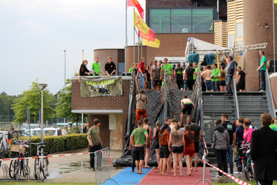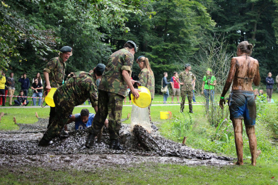 De deelnemers beklommen luchtkussens, moesten opdrukken, een balk sjouwen en door de modder tijgeren. Vooral bij het laatste onderdeel waren legerreservisten nadrukkelijk aanwezig: ‘DOORKRUIPEN! TEMPO!’ Eenmaal bij de Vestingbar leverde dit mooie plaatjes op van doorweekte en bemodderde deelnemers. ‘Het was vet om te doen, maar zwaar. De reservisten stonden enorm te schreeuwen. Vooral die chick’, vertellen leden van doegroep Pineut. ‘Het leek wel chill, maar bij het tijgeren was ik behoorlijk de lul. We waren met zijn drieën, maar ik kreeg de volle laag water’, vertelt aankomende student Stijn Woudstra. Tom Huiskes vult aan: ‘Ze hebben volgens mij gewacht tot de zon weg is: het was best koud.’ Toch verraadt een glimlach dat ze een hoop lol hebben gehad.