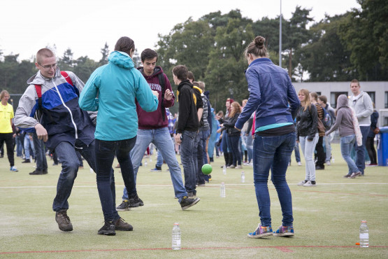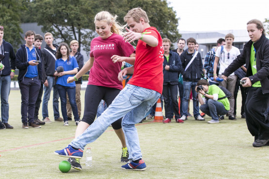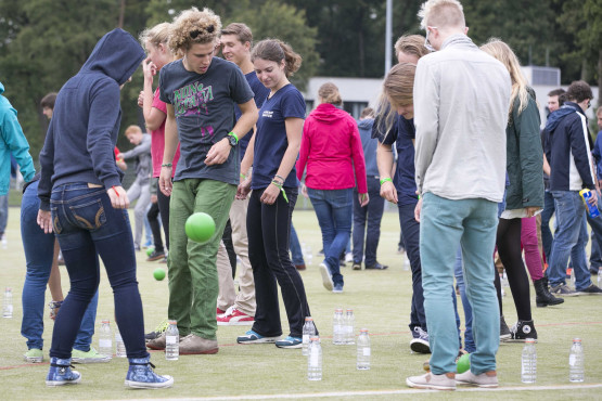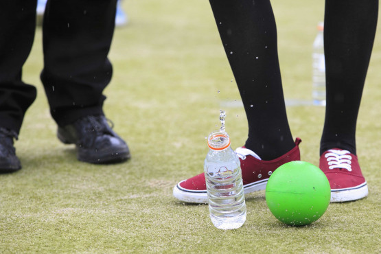 Het weer zit niet echt mee. De sfeer op het veld is best timide. Voor de start van het flessenvoetbal volgen de regels. De bal mag niet met de handen worden geraakt, flesjes mag je niet omtrappen, luisteren naar de stewards, niet tacklenen en iedereen moet actief meedoen. Als het fluitsignaal klinkt, worden er zo’n vijftig groene balletjes het veld ingegooid. Steeds meer mensen moeten het veld verlaten met een leeg flesje. Aan de twee scheidsrechters de taak iedereen met een leeg flesje het veld af te sturen. Het veld wordt steeds meer ingekort en na een half uur is Nora de winnares van de wereldrecordpoging flessenvoetbal.