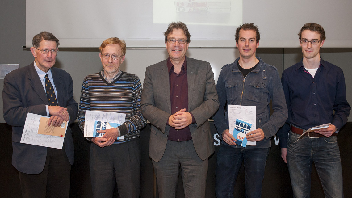 De winnaars van het UT-dictee met in het midden rector Ed Brinksma, v.l.n.r.: Rein Leentfaar, Peter Daalmans, Ed Brinksma, Kamiel Cornelissen en Laurens Klein Kranenburg.