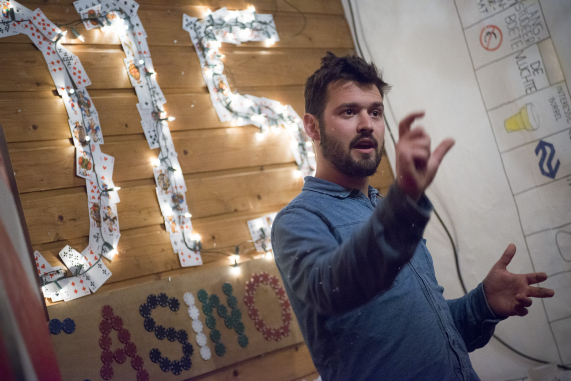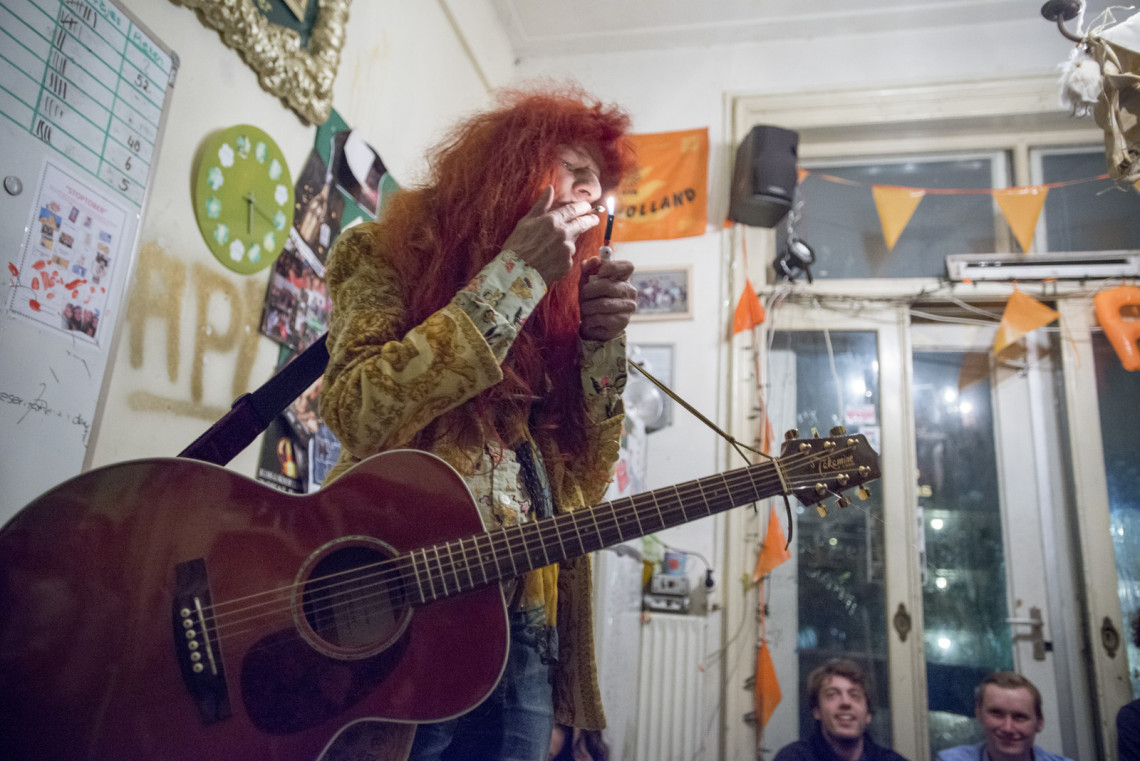In de volle, maar toch erg gezellige kamer van huize Probitas trad de protestzanger Armand op. Zijn bloemenkleding en felgekleurde rode haar hinten op de onderwerpen en sfeer van de avond: Armand is overduidelijk een hippie. Terwijl het publiek vol spanning zat te wachten, stemde hij nog even rustig zijn gitaar en nam nog een slok koffie. Voordat hij echt ging spelen, werd nog even de gedraaide shag aangestoken en een trekje genomen met de uitspraak: ‘No blow, no show.’ De gebruikelijke thema’s als seks en drugs kwamen veelvuldig terug. Naast de gitaar begeleidde hij zijn nummers met een mondharmonica. Hij wist het publiek goed te vermaken door sterke verhalen te vertellen met hier en daar een gewaagde opmerking als: ‘ADHD betekent Aan De Hard Drugs’. Zijn gevatte liederen en uitspraken gebruikte hij om de samenleving in een ander daglicht te stellen dan het bestaande beeld. Armand had veel interactie met het publiek. Zo liet hij zijn eigen drugsgerelateerde alfabet horen aan de hand van letters die de aanwezigen noemden. De B is van blow, de P van paranoia, maar ‘de vetste is de R, de R is namelijk van roken, iets wat ik graag doe.’