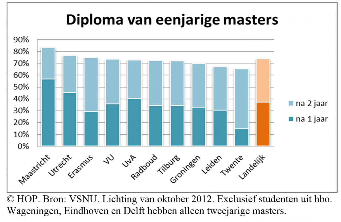 Dat blijkt uit nieuwe cijfers van universiteitenvereniging VSNU. In de eenjarige masteropleidingen haalt 37 procent op tijd het diploma. De UT scoort met vijftien procent ver beneden gemiddeld en komt met eenjarige masteropleidingen als slechtste uit de bus. Bij de tweejarige opleidingen doet de UT het iets beter. Daarbij is het landelijke gemiddelde 40 procent, op de UT 34 procent.