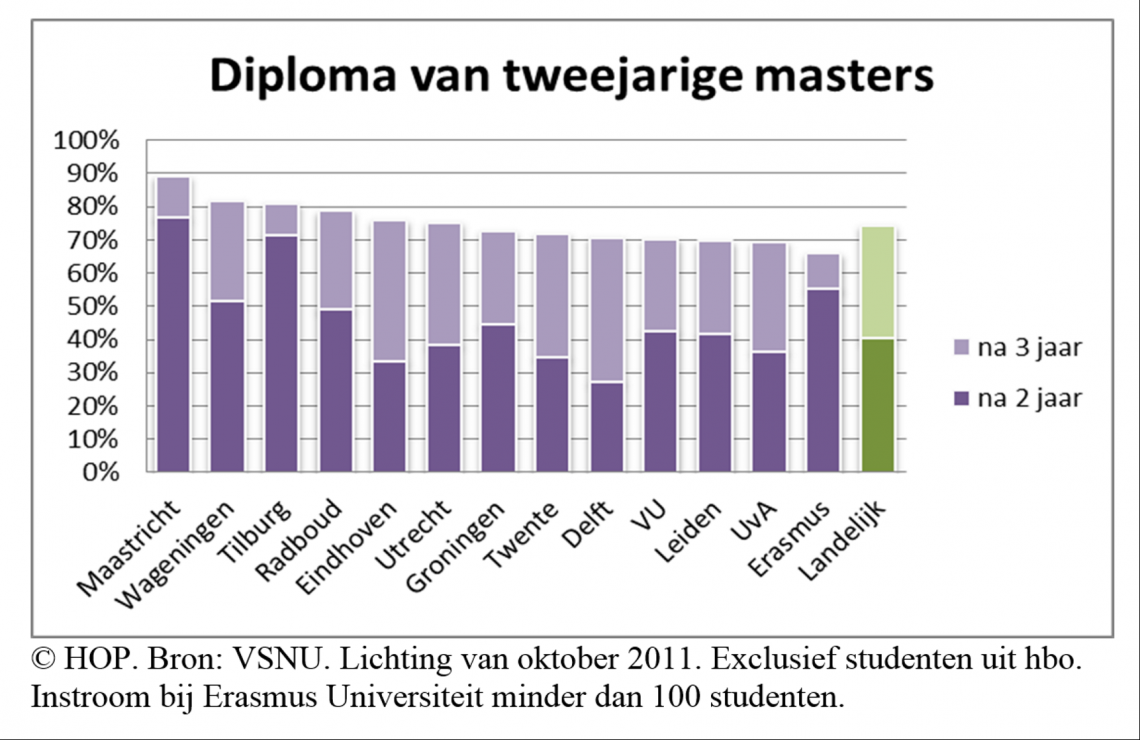 Na één jaar uitloop is driekwart afgestudeerd, zowel in de eenjarige als in de tweejarige opleidingen. Zo’n vijftien procent van de masterstudenten valt uiteindelijk uit of doet er veel langer over.