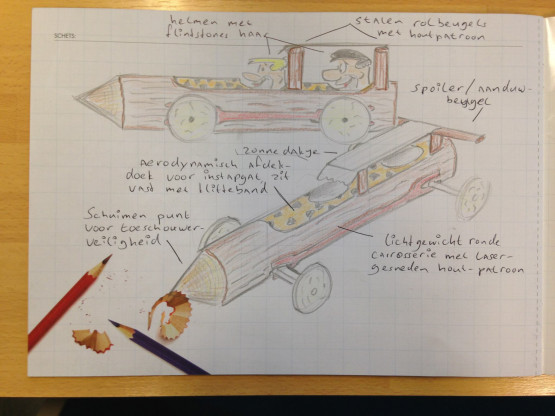 ‘We kregen een pakket thuisgestuurd waar je mee aan de slag moet om een ontwerp voor de zeepkist te maken. Zo bedachten we het ontwerp voor onze Flintstones zeepkist. Dit is een boomstamontwerp waar twee personen achter elkaar zitten. Het ontwerp werd beoordeeld door Red Bull en is goedgekeurd om aan de start te mogen verschijnen. Dat is op zich best bijzonder, aangezien er van de 1500 inschrijvingen uiteindelijk maar 60 starten. Het Red Bull promotieteam is nog langs Robberts huis gegaan en heeft de hele tuin met blikjes bestrooid, helaas waren we er toen niet bij.’