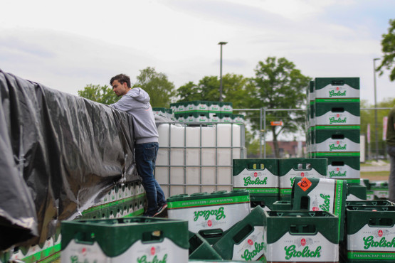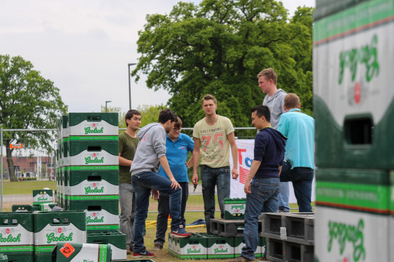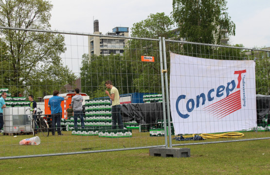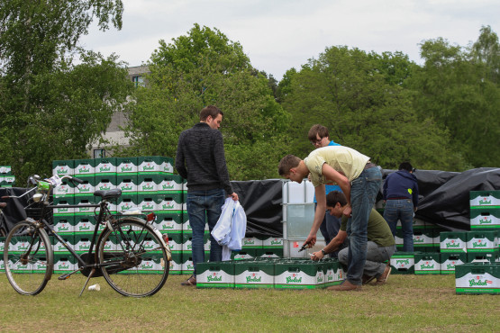 ‘De vrachtwagen van Grolsch, onze sponsor, kwam ons vanochtend 2000 kratten brengen om een zwembad te bouwen’, vertelt Ruben Herrebrugh (22) van ConcepT.