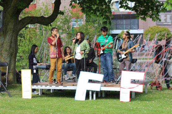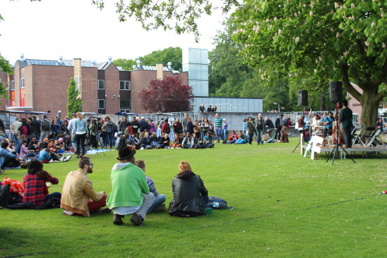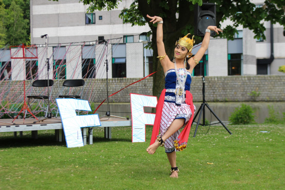 Er komen niet alleen studenten op het festival af, op de grond zitten ook veel kinderen en ouders. ‘Er zijn niet zoveel Indonesische gemeenschappen in Enschede, mensen voelen zich hier verbonden met elkaar’, verklaart Noor Rachman.
