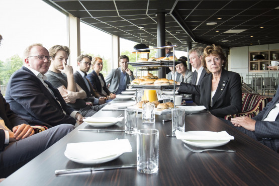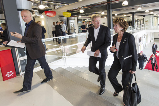 Dat gebeurt om drie uur, een uur eerder dan gepland, in de Waaier. Maar voor het zo ver is, brengt ze eerst een bezoek aan The Gallery. In het Grandcafé gaat ze in gesprek met ondernemers zoals de UT-alumni Jaap Beernink van Golden Egg Check en Nico Nijenhuis van Clear Flight Solutions. In een tweede ronde spreekt ze investeerders zoals Paul Nederkoorn CEO of UT international Ventures en Casper Peeters van Xsens.