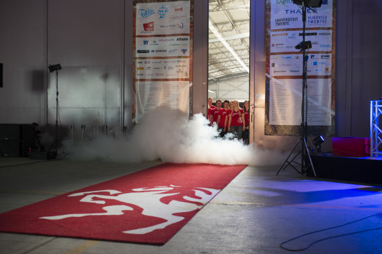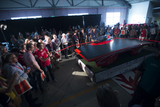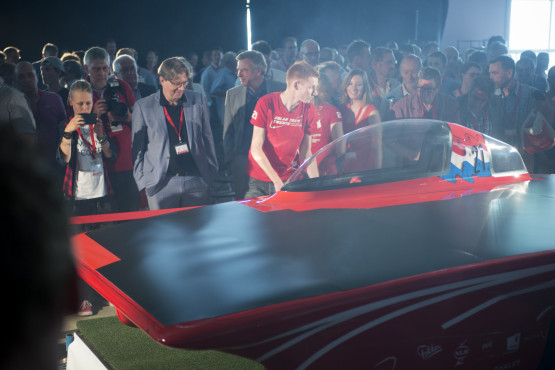 ‘Are you ready for Red One?’, eindigde hij zijn show waarop de deuren in de hangar open schoven en de nieuwe zonnewagen, omringd door de negentien teamleden, naar voren kwam. ‘We hebben hier met zijn allen hard naar toegewerkt', zegt Van den Hof na afloop. ‘Het is echt een mijlpaal.'