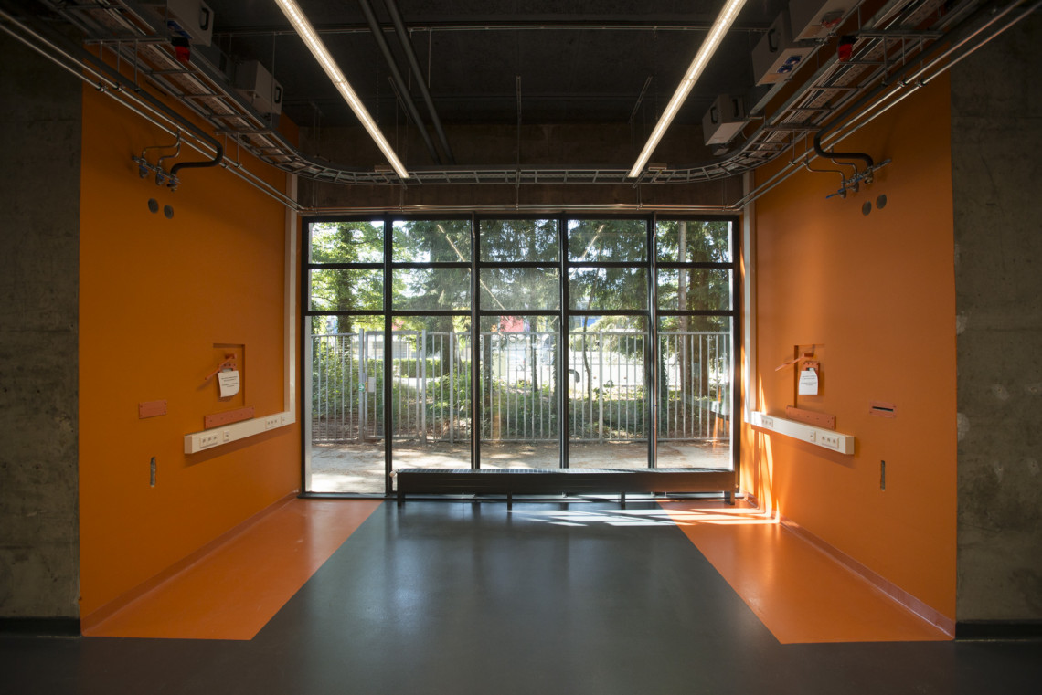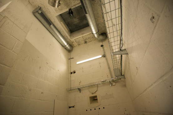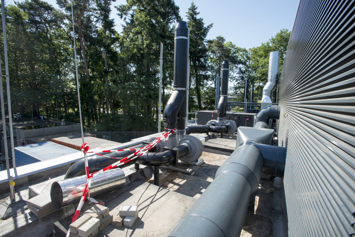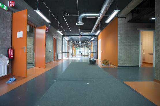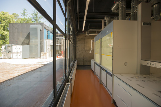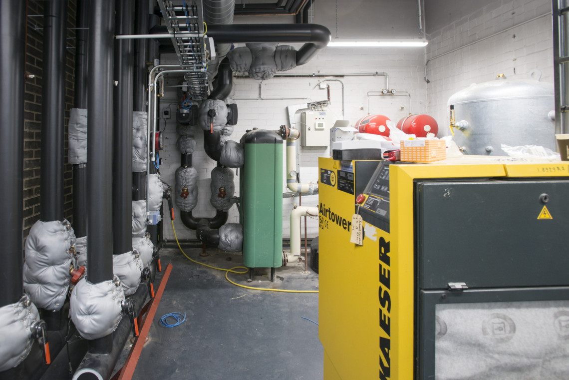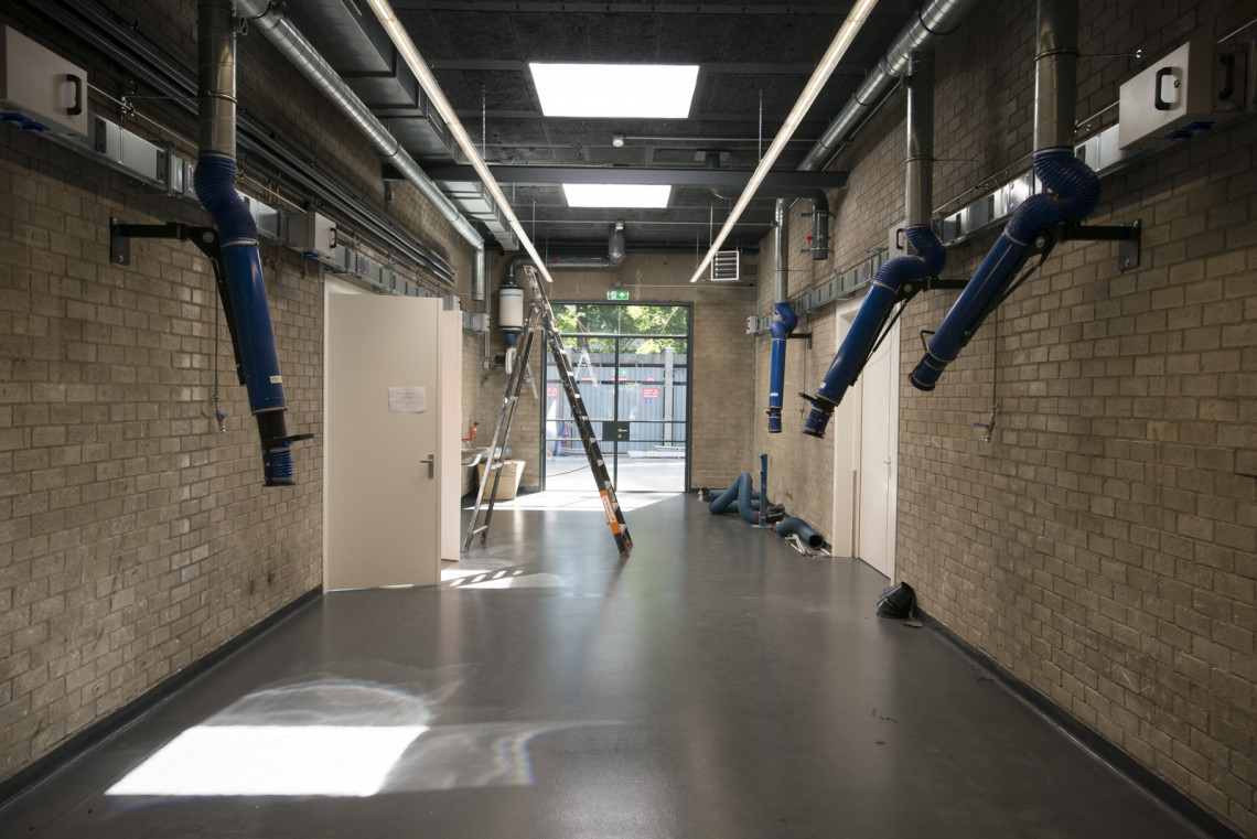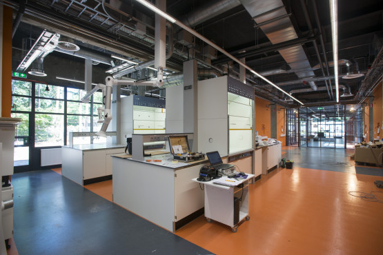 Een tour door het lab laat vooral veel, heel veel, techniek zien. Van zuurkasten, gaskasten, afvoerpijpen, machinekamers tot gascilinders en compressorruimtes. Hier en daar zijn elementen uit de oude architectuur overeind gebleven. Zoals de karakteristieke schoorsteen, die nu geen functie meer heeft. ‘Alleen nog maar symbolisch’, zegt Banis. ‘Die schoorsteen geeft cachet aan het pand.’