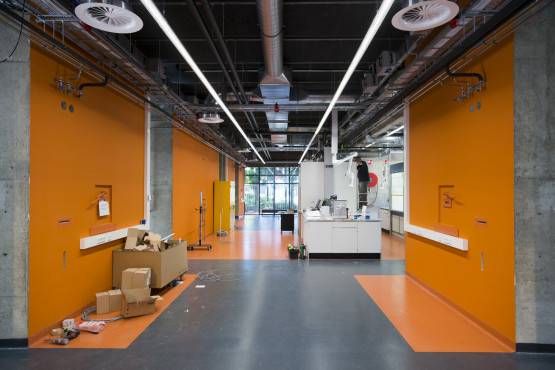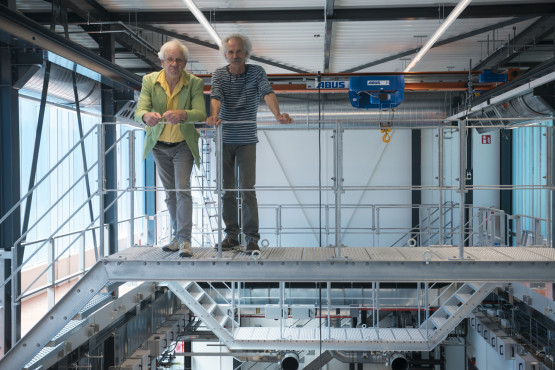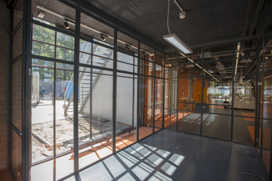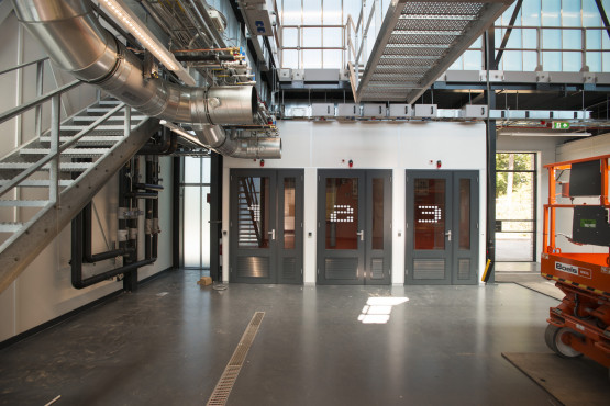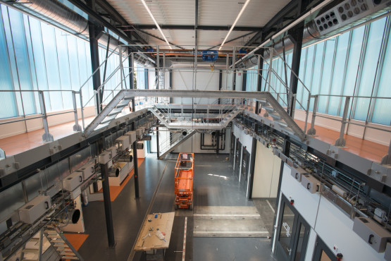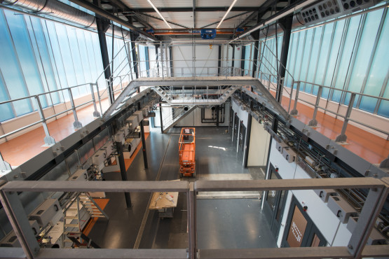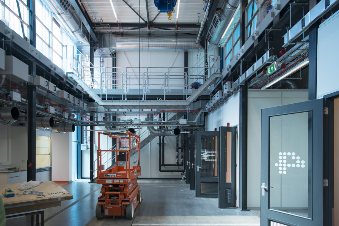 Banis laat ook de enorme loopbruggen zien. ‘Dat maakt het werken aan hoge opstellingen makkelijk en veilig.’ Ook zijn in de proceshal zogenaamde inloopboxen gemaakt, waar onderzoekers aan individuele projecten kunnen werken.