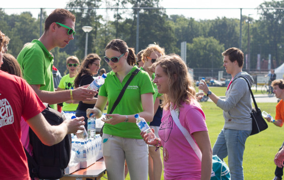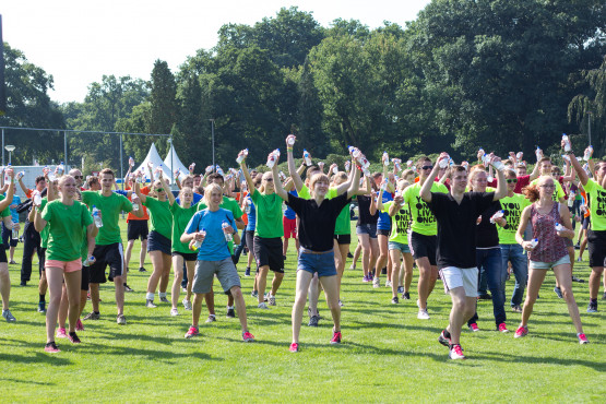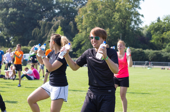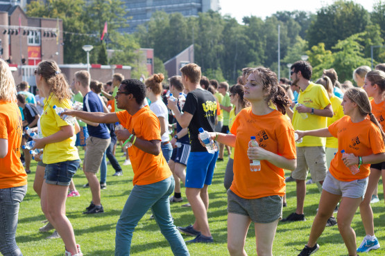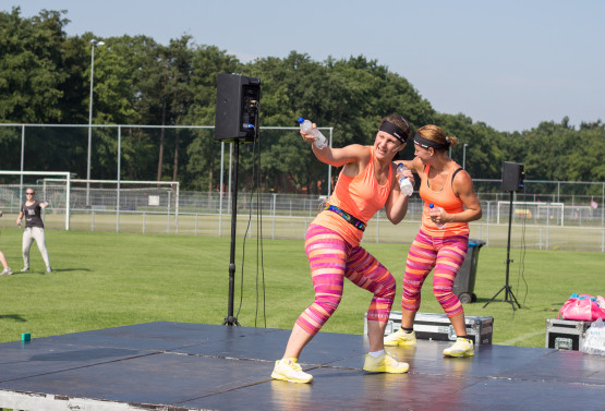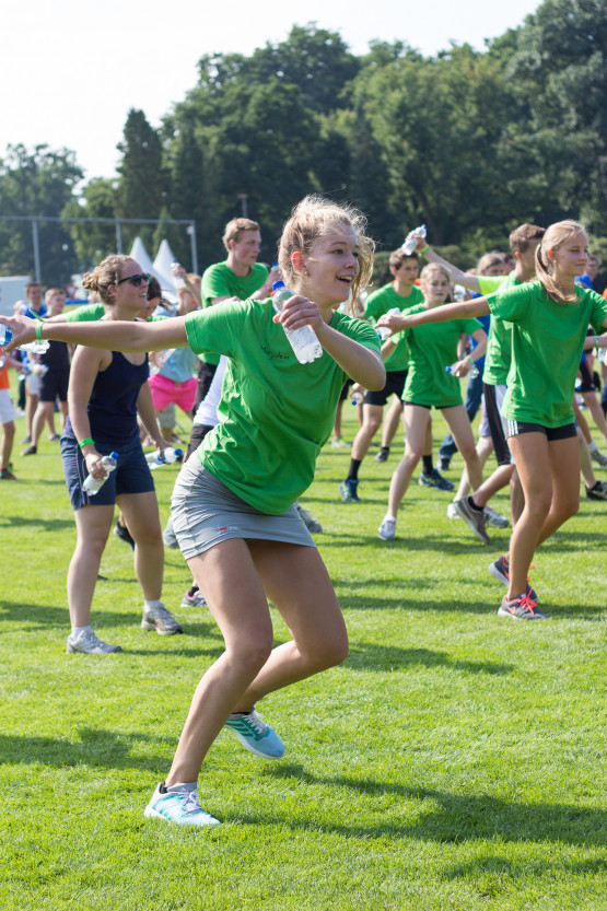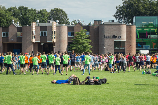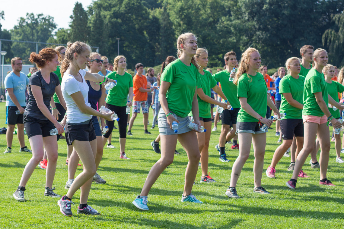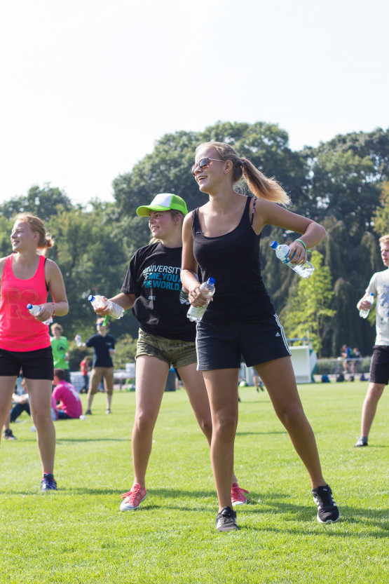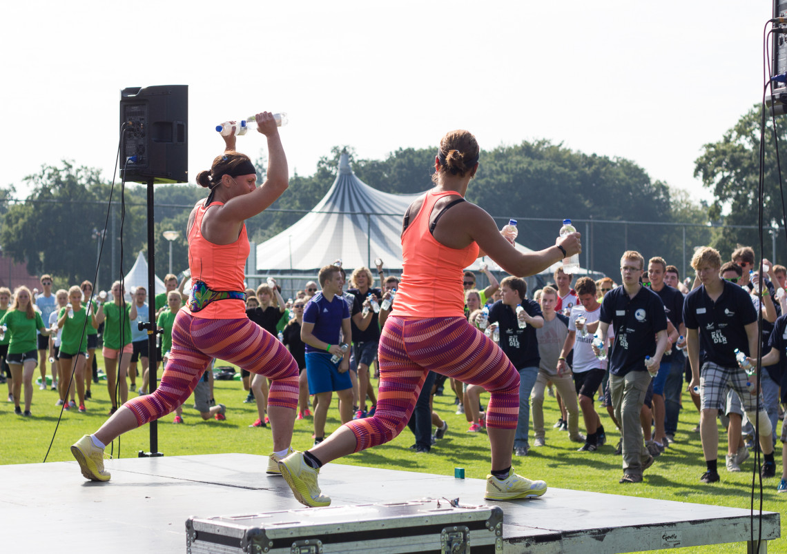 De groep eerstejaars danst met zijn allen rond het podium waarop twee dames in felgekleurde outfits de strakke warming-up-moves voordoen. Het is mooi weer buiten, het halve veld staat vol. Iedereen maakt zich klaar voor de sportactiviteiten die later op de dag gaan plaatsvinden.